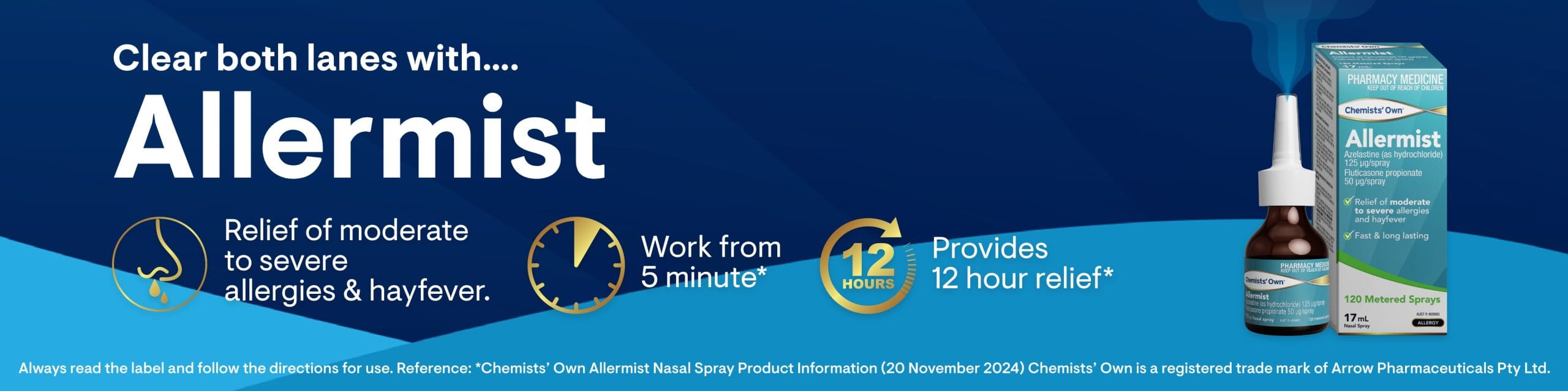 If you’re one of the millions of Australians who suffer from moderate to severe allergies or hayfever, you know how disruptive symptoms like a runny nose, sneezing, nasal congestion and itchy eyes can be. Fortunately, Chemists’ Own Allermist is here to help you take back control and enjoy your day — symptom-free.
