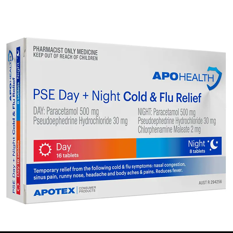 Apohealth PSE Day & Night Cold & Flu is for the temporary relief of cold & flu symptoms including: nasal congestion, sinus pain, runny nose, headache and body aches & pains. Reduces fever.